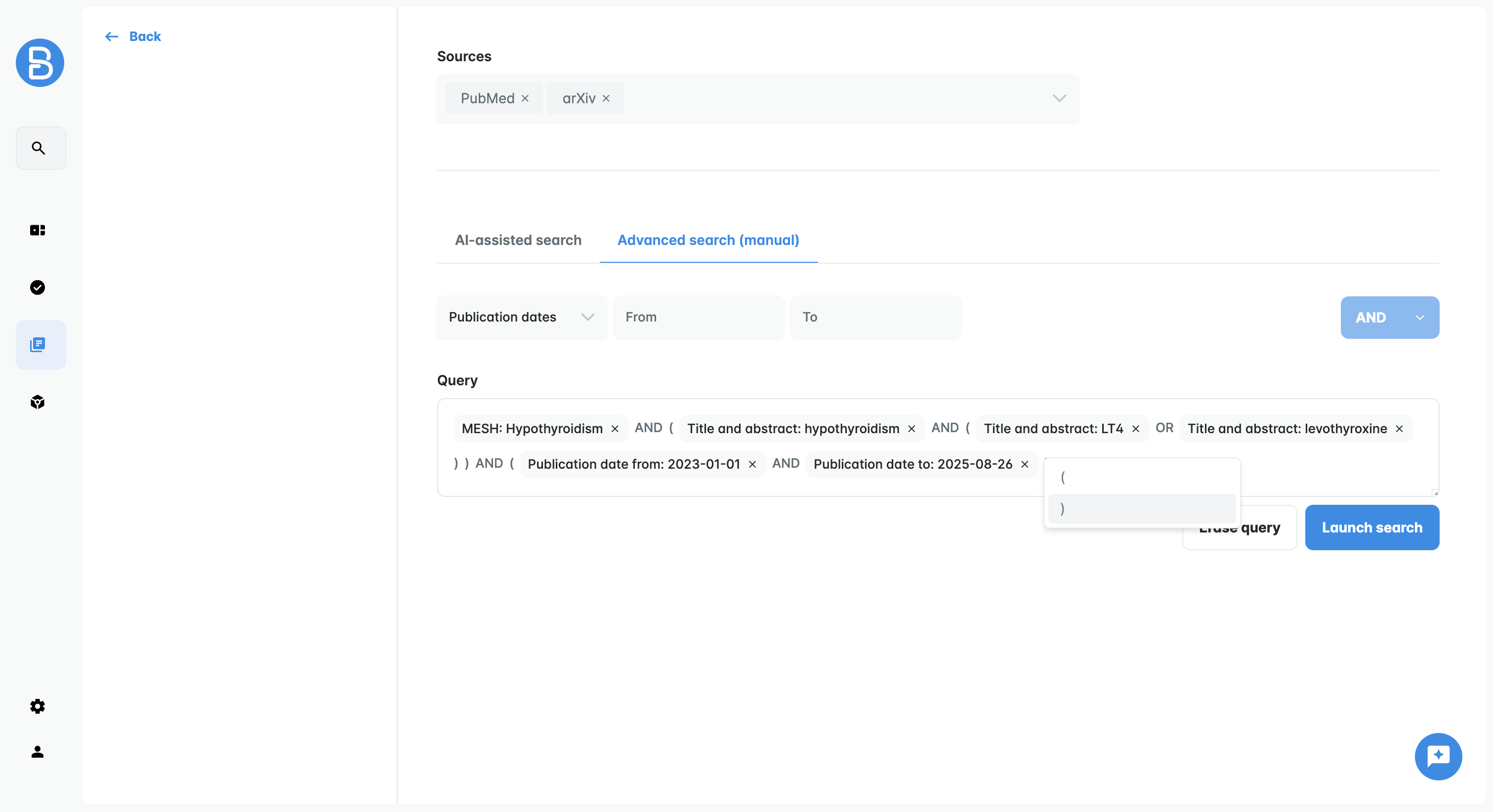 For example: "MESH = Hypothyroidism AND Title = LT4 OR Title = levothyroxine" will result in "MESH = Hypothyroidism AND (Title = LT4 OR Title = levothyroxine)".