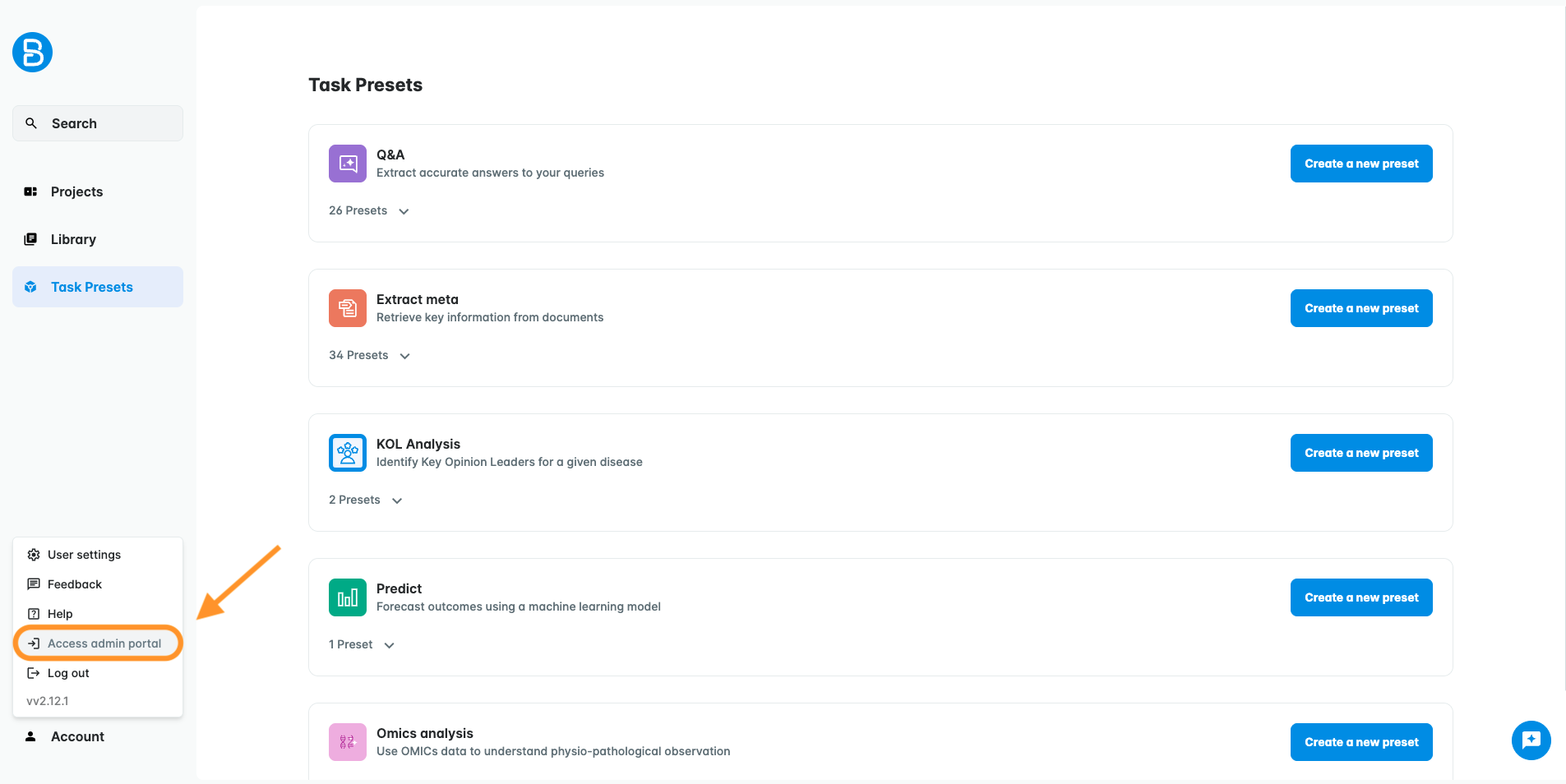 From the Admin Portal, the "Access Biolevate" option in the same menu allows you to return to the main application.